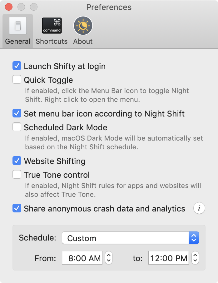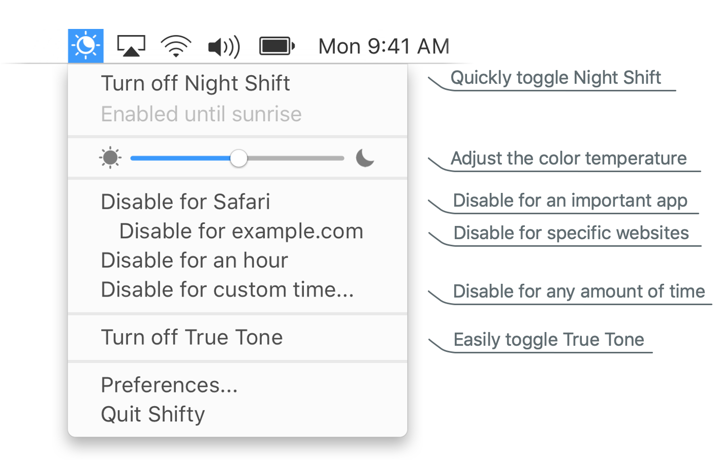 Shifty was made to expand the capabilities of the built in Night Shift feature in macOS. You can disable Night Shift for specific apps, websites, and custom time periods. It also provides easy access to a slider to fine tune your color temperature. With Shifty, Night Shift becomes a power user feature!