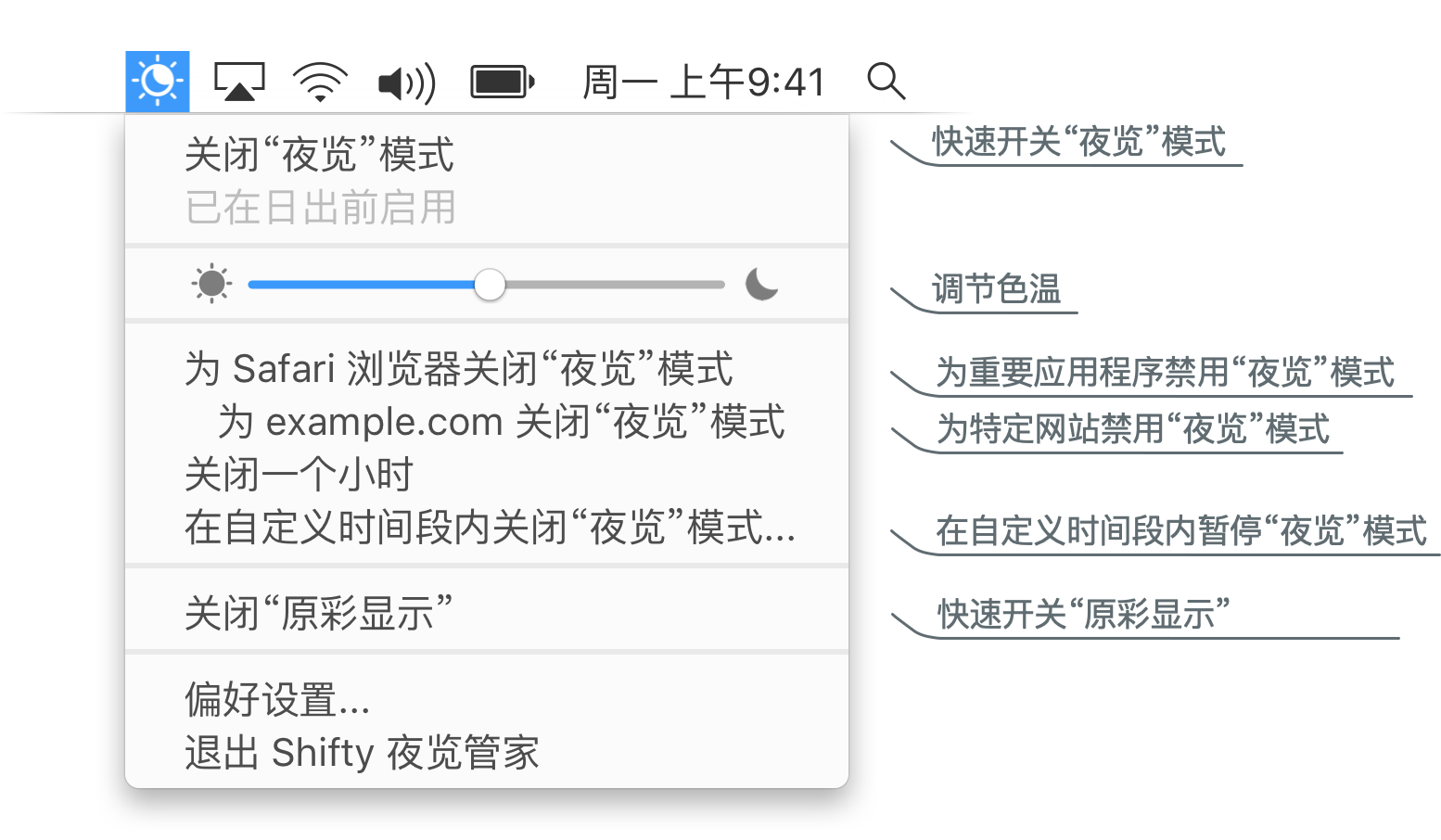 Shifty 夜览管家为 macOS 内置的夜览模式赋予更多便捷与自定义控制选项。 你可为特定应用程序、网站和在自定义时间段暂时关闭“夜览”模式。 此外,易于访问的滑块使完善色温变得轻而易举。 有了 Shifty 夜览管家,“夜览”模式得以成为专业用户的天作之合。